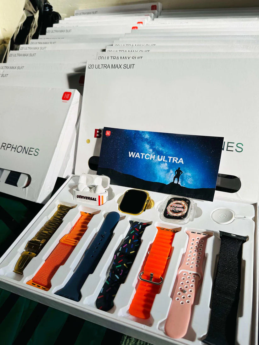 Express your style with seven interchangeable straps for your smartwatch. Whether you're going for a sporty look or a more sophisticated vibe, there's a strap to suit every occasion and outfit.With the i20 Ultra Max bundle, you'll enjoy seamless connectivity, immersive entertainment, and peace of mind knowing that your devices are protected and personalized to your taste. It's the ultimate combination of form, function, and fashion for the modern tech enthusiast.